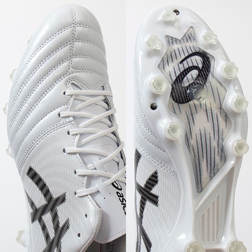 ●デジタル設計により、大胆にくり抜かれたアウトソールが、軽量性と屈曲性を生み出す。超薄型×高硬度仕様で軽量性とスプリント時に必要な反発性をサポート。先端にはグリップ性に優れた変形円柱型スタッド+ブレード型サブスタッドでパワーロスを抑制。より足と一体化することで、ピッチに力を伝え、加速をサポートする。