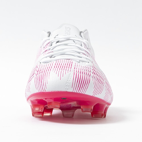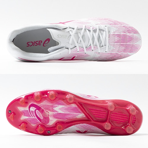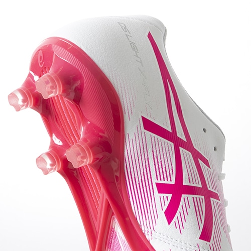 ●デジタル設計により、大胆にくり抜かれたアウトソールが、軽量性と屈曲性を生み出す。超薄型×高硬度仕様で軽量性とスプリント時に必要な反発性をサポート。先端にはグリップ性に優れた変形円柱型スタッド+ブレード型サブスタッドでパワーロスを抑制。より足と一体化することで、ピッチに力を伝え、加速をサポートする。
