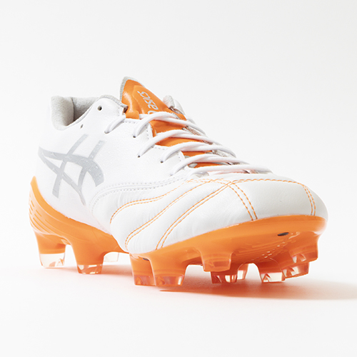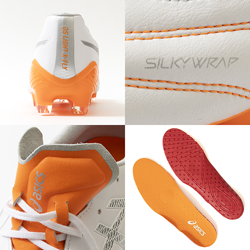 ●やわらかなSILKYWRAPがトラップ時のズレを抑制。素足感覚のフィット感で繊細なタッチを生み出す、従来の天然皮革よりもやわらかなSILKYWRAPをアッパー前足部に使用。優れた伸縮性がスパイクの中のズレを低減。いつの間にか「伸び切ってしまう」天然皮革と異なり、SILKYWRAPは試合終盤や雨天時でも伸びの戻りが持続する「耐久フィット」。