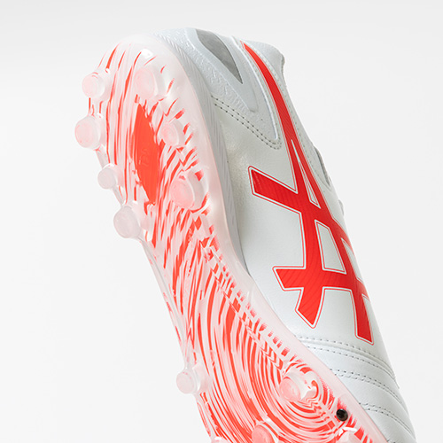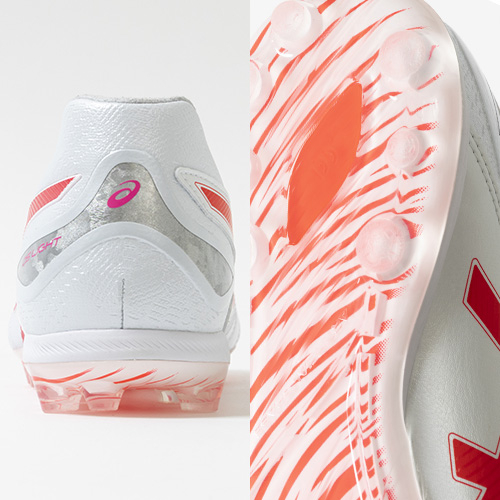 ●人工芝でグリップは発揮しつつ、回旋時にひっかかりにくいようスタッド形状を修正。突き上げを軽減するために多本数のスタッドを採用しつつも、透明な素材にしていることで、スタッドの多さを感じさせにくく、底面のデザインが見え存在感を発揮する人工芝専用ソール。
