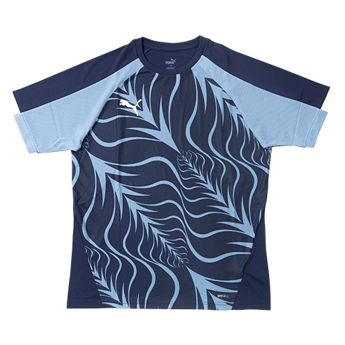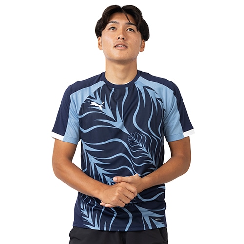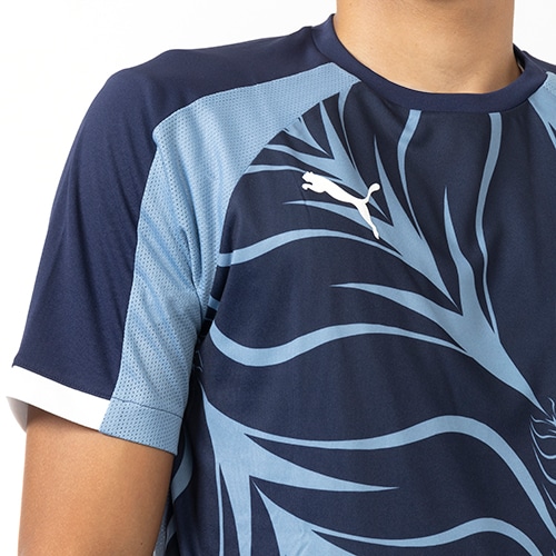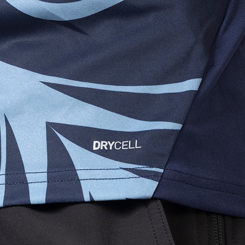 サッカーシーンにオススメな軽量Tシャツで、ブラックのベースに全面にアクセントカラーを配置しており、スタイリッシュで洗練されたデザインが魅力です。メッシュ素材を使用しているため、軽量かつ通気性抜群で、長時間の運動でも快適な着心地を提供します。トレーニングでもオフピッチでも衣服内を快適な状態に保つdryCELLテクノロジーを搭載しています。