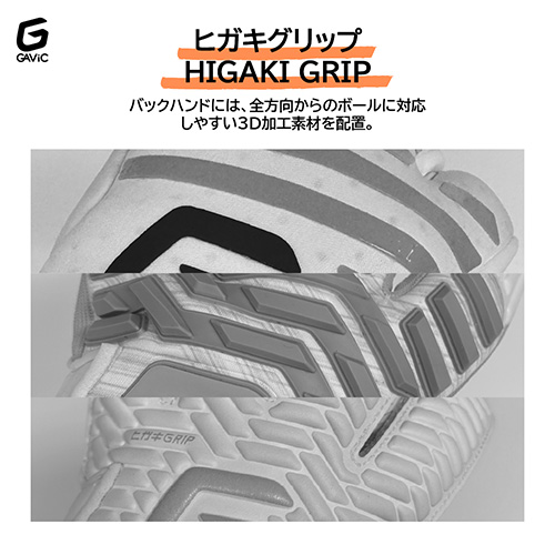 ●手の甲:ヒガキグリップ:あらゆる方向からのアプローチに対応。小指側をパームから巻き込むことでフィット感が向上。