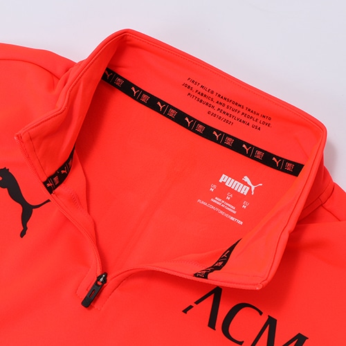 - セリエA(イタリア)、ACミランの2021-2022シーズンモデルプレマッチ1/4ジップトップ。公式戦試合前トレーニング時に選手着用予定のモデル。伸縮性のある袖口、胸には大胆なACミランとPUMAのロゴがあり、PUMAの革新的な吸水速乾機能のあるDRYCELLテクノロジーを搭載。