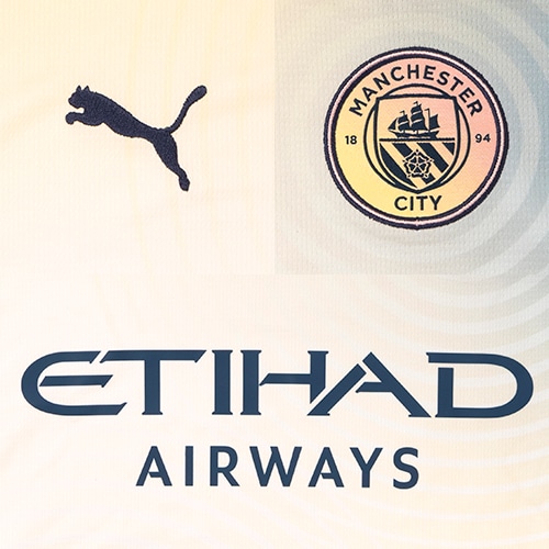 生涯シティファンであるノエル・ギャラガーが共同デザインしています。今シーズンの4thユニフォームは、一時代を築いたアルバムへのオマージュ。ヨーロッパの一部の試合でのみ使用され、クラブが欧州の大舞台で輝きを放つ姿を表現しています。デザインは、Definitely Maybe の象徴的なイメージに呼応する大胆な美学を特徴とし、マンチェスターの街とバンドに敬意を表しています。カラーリングは、ライトストローをベースに、ブルーのサイドパネルと袖を配し、袖口やパネルには控えめなポピーピンクのディテールが施されています。マリンブルーの音波模様がユニフォームにあしらわれており、OASIS のアルバムジャケットのカラーパレットを巧みに取り入れています。
