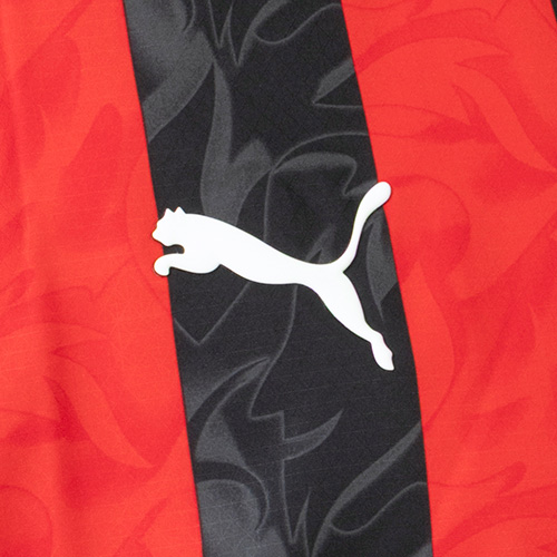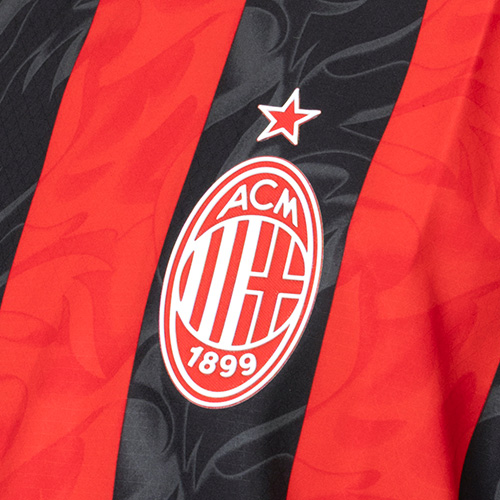 クラブ創設者 Herbert Kilpin(ハーバート・キルピン)が1899年に語った「赤は炎のように、黒は相手に恐怖を与える色」というビジョンを現代的に再解釈したデザイン。伝統のレッド&ブラックに燃え上がるような炎のグラフィックをストライプ上に重ね、真紅のエンブレムを配した、ACミランのスピリットを象徴する一着に仕上がっています。