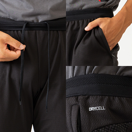 必需品を収納できるジッパーポケットと、動きを妨げない伸縮性ウエストバンドが特徴。スリムなカットと吸湿発散性に優れたdryCELL(ドライセル)テクノロジーを採用。