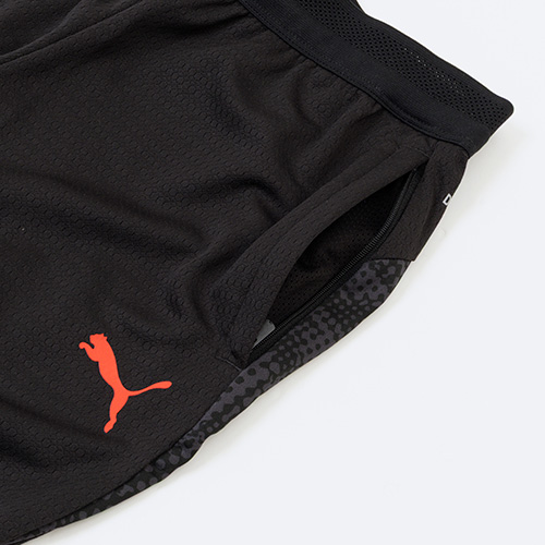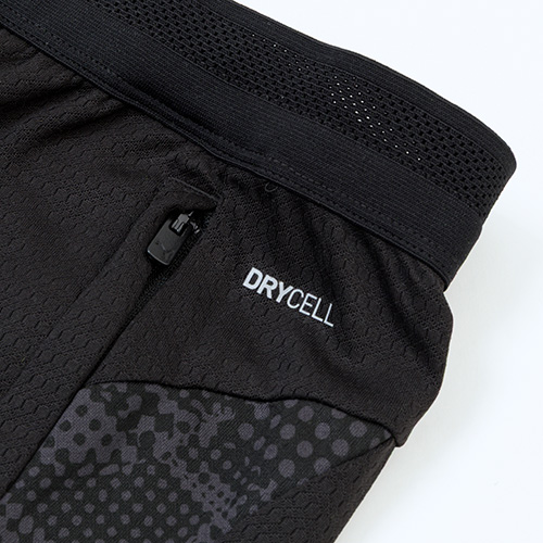 必需品を収納できるジッパーポケットと、動きを妨げない伸縮性ウエストバンドが特徴。スリムなカットと吸湿発散性に優れたdryCELL(ドライセル)テクノロジーを採用。