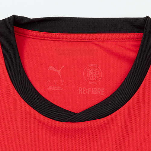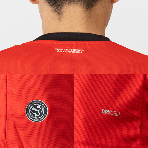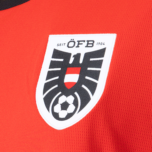 伝統的な赤と黒のカラーに、ハートの上にオーストリアサッカー協会OFBの紋章があしらわれ、世界に見てもらいたいという情熱を表現する愛国的なルックを演出しています。