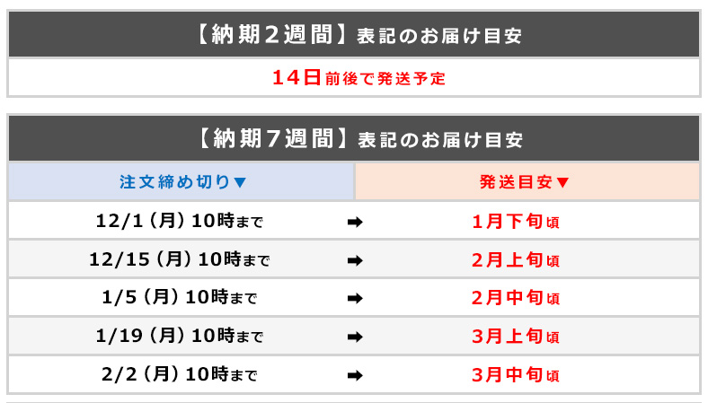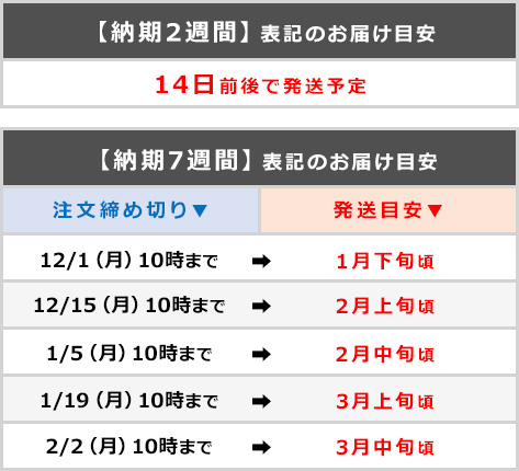 ※上記はあくまで目安です。生産状況によりお届け時期が前後する場合がございます。