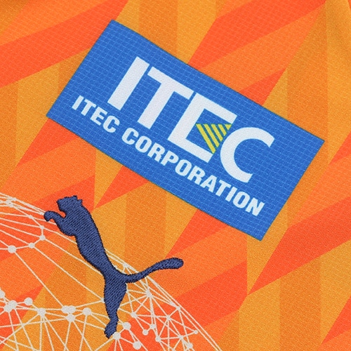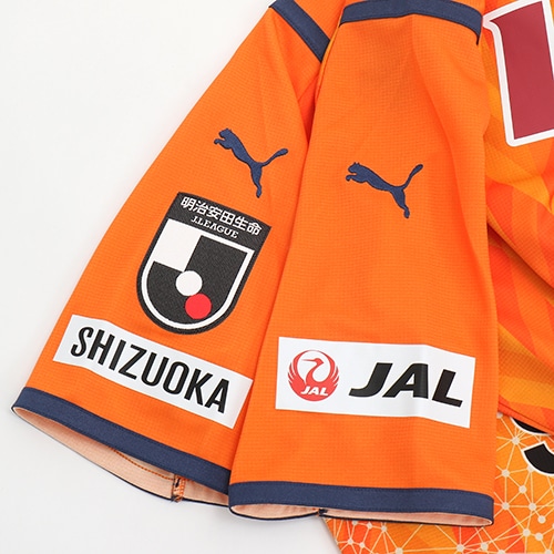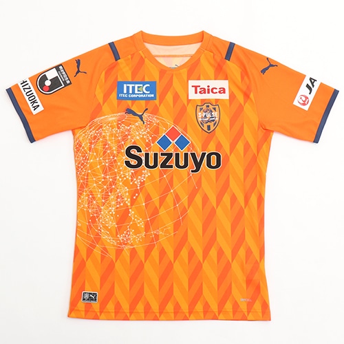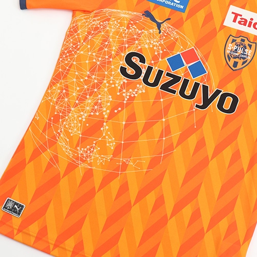静岡の代表的産業である茶業からイメージをした茶葉のパターン柄を全面にあしらい、 胸にはエンブレムの象徴である地球儀をワイヤーアートでアレンジ。ホームタウンのカルチャーと伝統 が織り込まれた一着に仕上がっています。