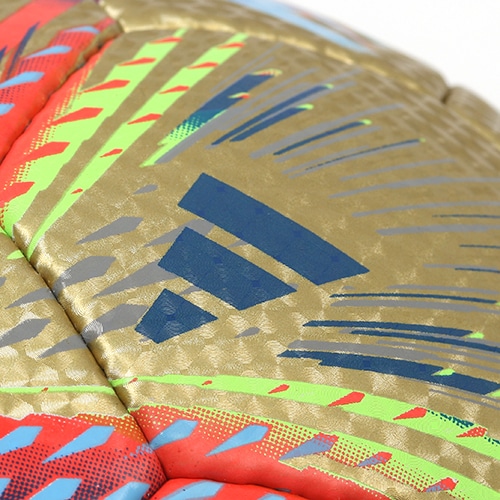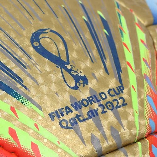 「アル・リフラ」はアラビア語で「旅」。カタールの国旗・文化・建築物から着想を得たデザイン。パネルには世界を一体化させるフットボールの価値を表す言葉を6つの言語で表現しています。表面にはカタールの伝統産業である真珠を連想させるパール調の光沢原反を採用。湧き上がる様々な感情や多様性に富んだ各国のアイデンティティ、そして現代サッカーのプレースピードを連想させる多彩なカラーを使用しています。