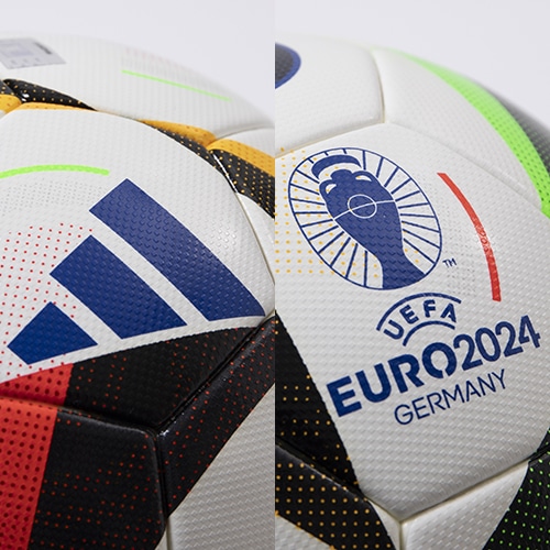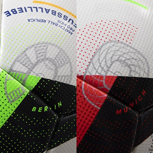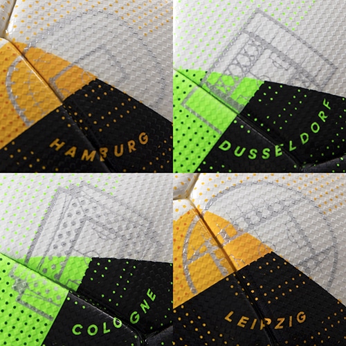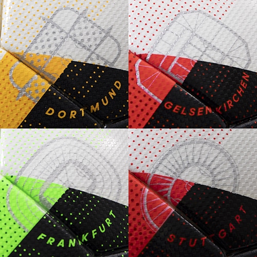 ドイツ語で「フットボールへの愛」を意味する『FUSSBALLLIEBE』のデザインは、フットボールの喜びと大会トーナメントのエネルギーよりインスピレーションを得ています。色鮮やかなエッジ、曲線、ドット表現にて強調された目立つ黒い翼形状を通じて、ボール自体の動きや試合でのエネルギーを表現しています。また、力強い赤、青、緑、オレンジカラーの使用は、対戦国が大会トーナメントにもたらす活気と、世界中のファンから多くの愛を引き込むフットボールの純粋な純真さの双方を称賛しています。ボールには大会トーナメントで使用される各スタジアムが開催都市の名前と共に表現されています。