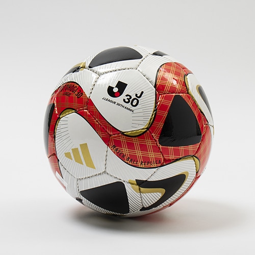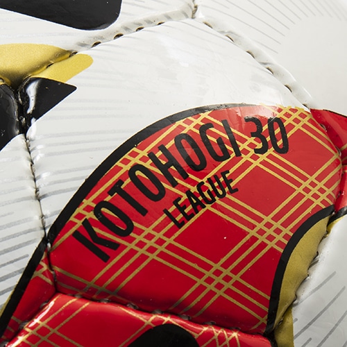 30周年の華やかさと日本の和を融合させたオリジナルボールです。2023年FIFA主要試合球『オーシャンズ』のデザインをベースに、カラーリングではJリーグカラーの赤・白・黒を採用。また、デザイン細部ではJリーグ全クラブの印字をゴールドカラーで施しつつ、無病息災や厄除けの意味を持つ“三重菱”の和柄も採用し、近年の新型コロナウイルスの影響による生活での人々への想いも込めています。名称の「コトホギ30」は、言葉で祝うこと、祝賀を意味する “言祝ぎ”と“30周年”を組み合わせた造語であり、日本のJリーグ30周年を記念した祝福のメッセージを世界へ発信いたします。