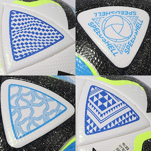 ●新形状・スピードシェル パネルシェイプ:他に類を見ないアディダス独自の新形状「スピードシェル」。大小2種類の異形状のパネルを20枚使用した組み合わせは、より良い飛行安定性に貢献します。