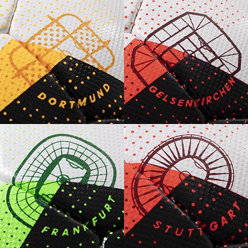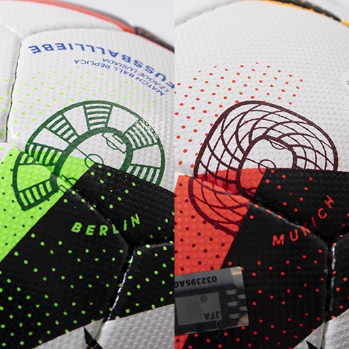 ドイツ語で「フットボールへの愛」を意味する『FUSSBALLLIEBE』のデザインは、フットボールの喜びと大会トーナメントのエネルギーよりインスピレーションを得ています。色鮮やかなエッジ、曲線、ドット表現にて強調された目立つ黒い翼形状を通じて、ボール自体の動きや試合でのエネルギーを表現しています。また、力強い赤、青、緑、オレンジカラーの使用は、対戦国が大会トーナメントにもたらす活気と、世界中のファンから多くの愛を引き込むフットボールの純粋な純真さの双方を称賛しています。ボールには大会トーナメントで使用される各スタジアムが開催都市の名前と共に表現されています。