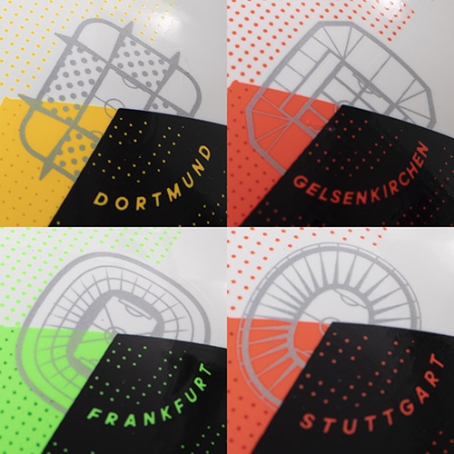 ドイツ語で「フットボールへの愛」を意味する『FUSSBALLLIEBE』のデザインは、フットボールの喜びと大会トーナメントのエネルギーよりインスピレーションを得ています。色鮮やかなエッジ、曲線、ドット表現にて強調された目立つ黒い翼形状を通じて、ボール自体の動きや試合でのエネルギーを表現しています。また、力強い赤、青、緑、オレンジカラーの使用は、対戦国が大会トーナメントにもたらす活気と、世界中のファンから多くの愛を引き込むフットボールの純粋な純真さの双方を称賛しています。