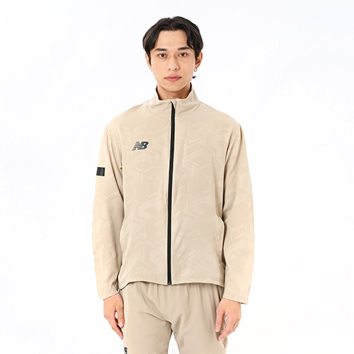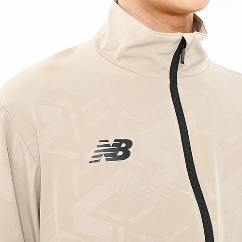 軽く伸縮性に優れたストレッチ素材を使用し、脇下部分を動きやすく通気性の良いメッシュで仕上げました。吸汗速乾性に優れたNB Dryに対応。NBメガスピードロゴをエンボス調の総柄で表現した一着です。