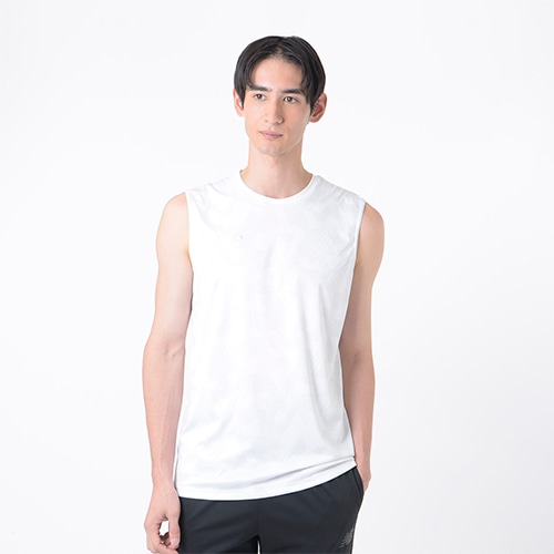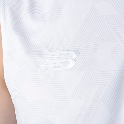 メガスピードモチーフの総柄スムースニットを前身頃、メッシュニットを後身頃に使用し、フライングNBロゴ刺繍、NB DRYロゴプリントで仕上げました。
