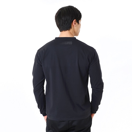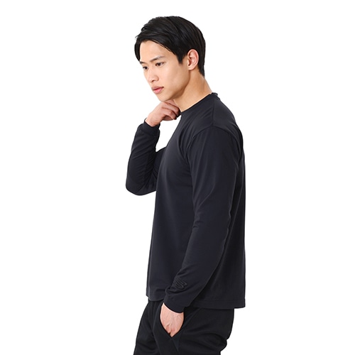 しなやかで暖かい風合いに仕上げたストレッチニット素材を使用し、裏起毛で一枚でも暖かさを確保。丸首タイプのシンプルなシルエットを合わせやすいブラックで提案します。
