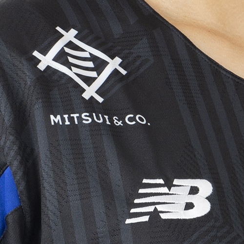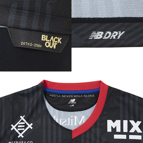 new balance FOOTBALLの代名詞"BLACK OUT"と連動したデザイン。シリアルナンバー入り。"誰色にも染まりたくない自分の思う理想の自分"がBLACKOUTのコンセプトであり、だれにも染まらないカラーであるブラックをボディに、衿や袖、裾脇にFC東京の青・赤を差しカラーとして採用。ブラックの中に青・赤が刺されることでよりFC東京カラーを木さだたせます。2024年のグローバルコンセプト"Life at the intersection"をテーマにスポーツとファッションの融合を掲げブラックのユニフォームにトーナルでFC東京のパターンを総柄で表現する事で、FC東京の強さや威厳がより引き出されます。オーセンティックにはジャガード柄のグラフィックに最先端な都市と建物が融合した建築デザイン、ゲームデザインやミュージックビデオなどのデジタルデザイン、唐草模様、江戸切子に代表される伝統工芸の要素を取り入れ、最先端を感じるデザインをユニフォームに落とし込んでいる。