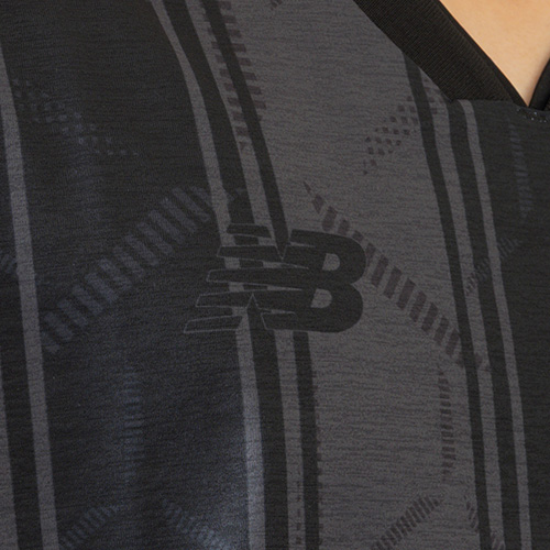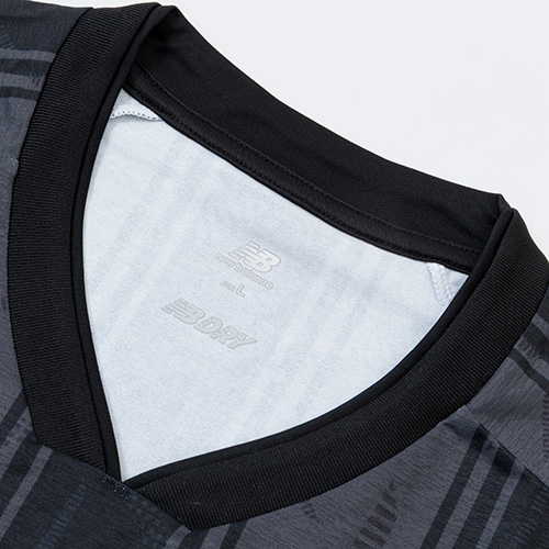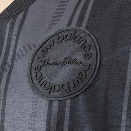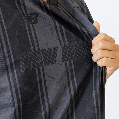 コットンライクなポリエステル100%素材を使用し、襟リブ仕様と裾スリットのデザインが、アクティブからオフピッチまで対応。右胸のNBロゴ刺繍と左胸のサークルロゴワッペンをクールなカラーでまとめた一着。
