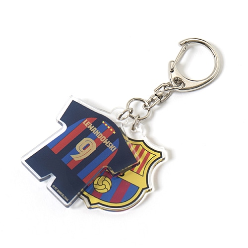 - スペイン・リーガエスパニョーラ、FCバルセロナのオフィシャルグッズ。2022-23シーズンユニフォームデザインのアクリル2連チャーム、#9 レヴァンドフスキ選手。