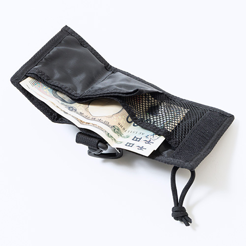 ●アクティブなシーンでも使い勝手のよいコンパクトなサイジングながら、お札・カード・小銭の収納部を完備。