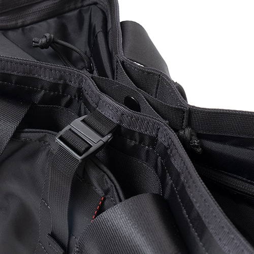 ●フロントに配したポケットはバックル式で、ラケットなど大きなものを収納してバックルで留めておくことが可能。