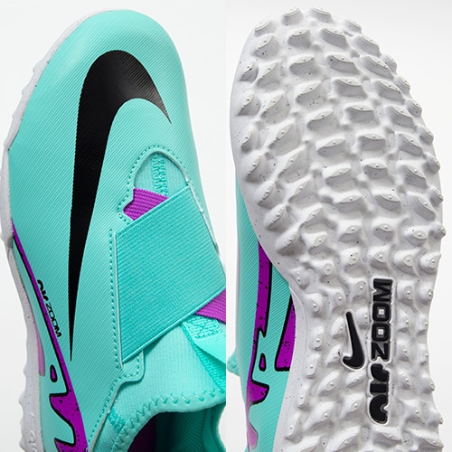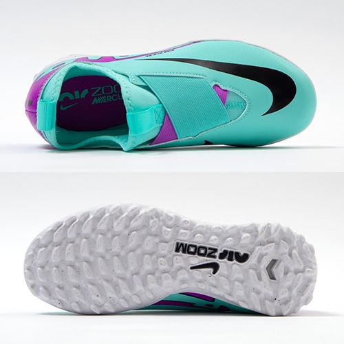 ●超薄型のNikeSkinオーバーレイによって足とボールの距離を縮め、ハイスピードでの正確なボールコントロールをサポート。柔らかく柔軟性に優れたメッシュ素材に薄いコーティングで、素足でサッカーをしているような感覚。