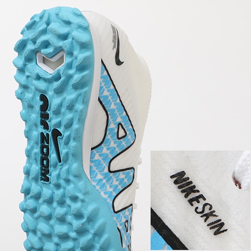 ●履き口には、柔らかく伸縮性のあるFlyknit素材を使用。足首を包み込み、しっかりと足元を固めます。アッパーには、柔らかく柔軟性に優れたメッシュ素材に薄いコーティングを施したNikeSkinを使用。 素足でサッカーをしているような感覚で、ボールをコントロールできます。