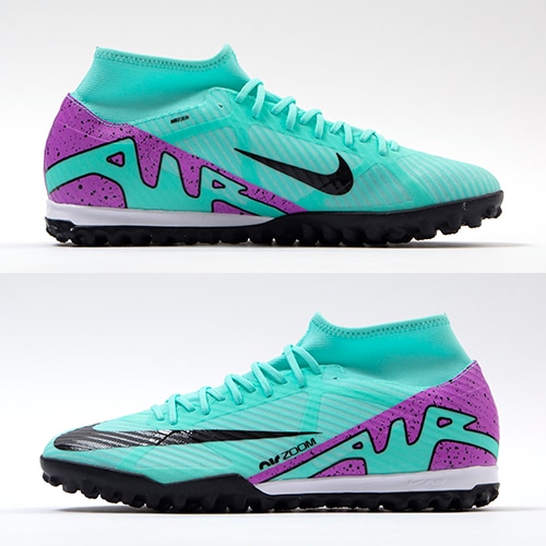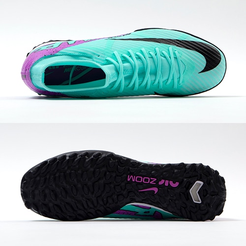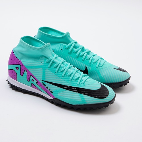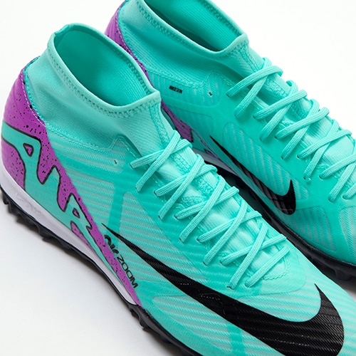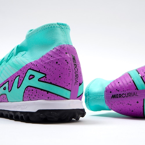 どのポジション、どの場所からも稲妻のようなスピードでゴールを狙える『AIR ZOOM MERCURIAL(エア ズーム マーキュリアル)』のハイカット形状「SUPERFLY(スーパーフライ) 9」のACADEMY(アカデミー)/コアモデルTF(ターフコート)対応トレーニングシューズ。
