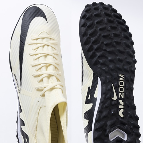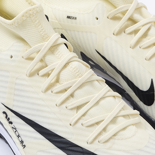 ●履き口には、柔らかく伸縮性のあるFlyknit素材を使用。足首を包み込み、しっかりと足元を固めます。アッパーには、柔らかく柔軟性に優れたメッシュ素材に薄いコーティングを施したNikeSkinを使用。 素足でサッカーをしているような感覚で、ボールをコントロールできます。