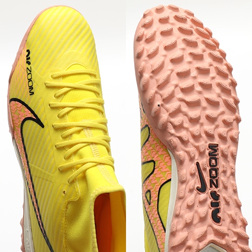 ●履き口には、柔らかく伸縮性のあるFlyknit素材を使用。足首を包み込み、しっかりと足元を固めます。アッパーには、柔らかく柔軟性に優れたメッシュ素材に薄いコーティングを施したNikeSkinを使用。 素足でサッカーをしているような感覚で、ボールをコントロールできます。