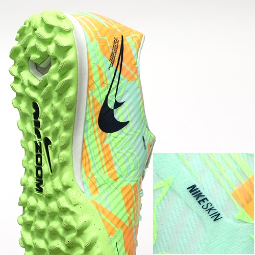 ●アッパーには、柔らかく柔軟性に優れたメッシュ素材に薄いコーティングを施したNikeSkinを使用。 素足でサッカーをしているような感覚で、ボールをコントロールできます。
