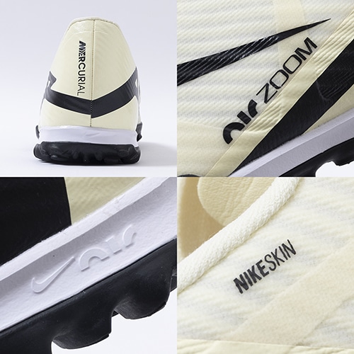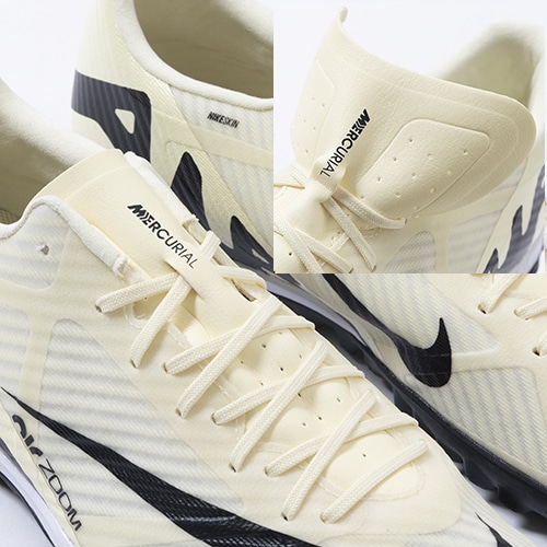 ●アッパーには、柔らかく柔軟性に優れたメッシュ素材に薄いコーティングを施したNikeSkinを使用。 素足でサッカーをしているような感覚で、ボールをコントロールできます。