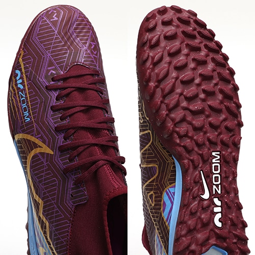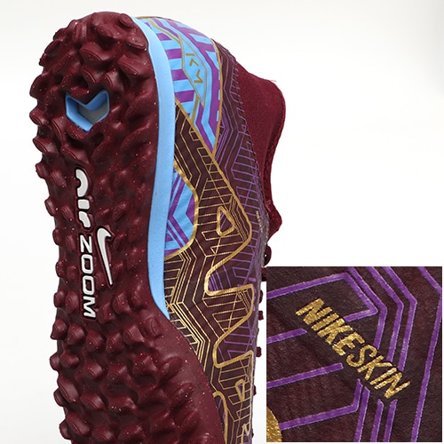 ●履き口には、柔らかく伸縮性のあるFlyknit素材を使用。足首を包み込み、しっかりと足元を固めます。アッパーには、柔らかく柔軟性に優れたメッシュ素材に薄いコーティングを施したNikeSkinを使用。 素足でサッカーをしているような感覚で、ボールをコントロールできます。