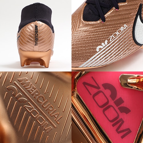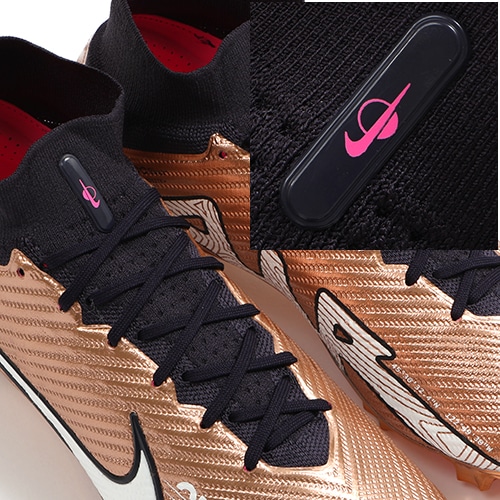 ●Nike史上初めて、サッカー用に作られた3/4レングスの「Zoom Airユニット」をプレートに内蔵。アスリートが着地するたびにファイバーが縮んで衝撃を緩和し、すばやく元の状態に戻るときに爆発的にパワフルな跳ね返りを生成。Airのスピードを実感し、命運を分けるプレーの最中も素早さをキープできる。