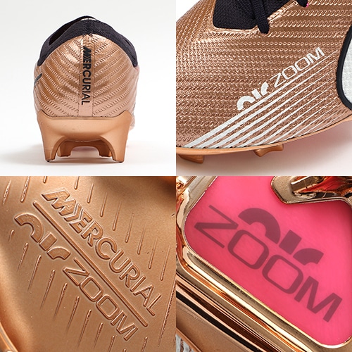 ●Nike史上初めて、サッカー用に作られた3/4レングスの「Zoom Airユニット」をプレートに内蔵。アスリートが着地するたびにファイバーが縮んで衝撃を緩和し、すばやく元の状態に戻るときに爆発的にパワフルな跳ね返りを生成。Airのスピードを実感し、命運を分けるプレーの最中も素早さをキープできる。