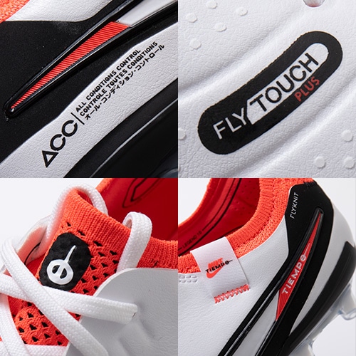 ●新開発の「Fly Touch Plus(フライタッチプラス)」エンジニアードレザーを使用。ティエンポのために作られた新しいレザーで、柔らかさ、軽さ、耐久性をもたらし、より優れたコントロールが可能。足首周りのFlyknitがしっかりとしたフィット感を提供します。天然皮革のように伸びすぎることが無くピッチや天候に関わらず、アスリートの足なじみ良い形のままで長い間維持されます。