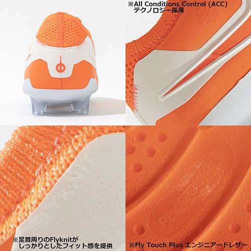 ●インサイド面には3D印刷のマイクロドットを施して重要な部分のボールタッチを高めています。フォームポッドをそぎ落とし、代わりとしてインナーに成形素材を使用。バランスの取れたデザインで、ボールの動きを制御しつつ足とボールの緊密な連携を感じられるようにしています。All Conditions Control (ACC) テクノロジーとの相乗効果で、雨天でも乾燥した天候でもグリップ性を発揮できます。