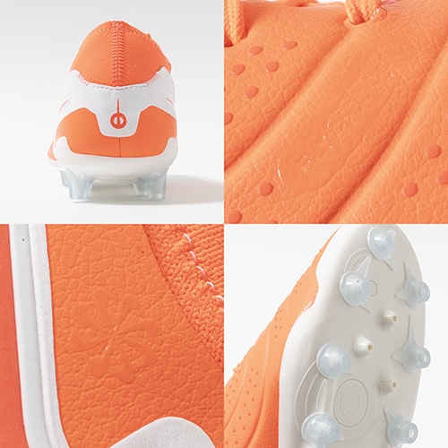●フォームポッドをそぎ落とした結果、ボールコントロール時のボールと足がさらに接近。 フォームポッドの代わりとして、インナーに成形素材を使用。 マイクロドットがシュート、ドリブル、パスのタッチゾーンを拡大。より洗練されたスタイルを実現。湿気のある天候でも乾燥した天候でもボールタッチが安定するようにデザインされたWet Touch仕上げ。