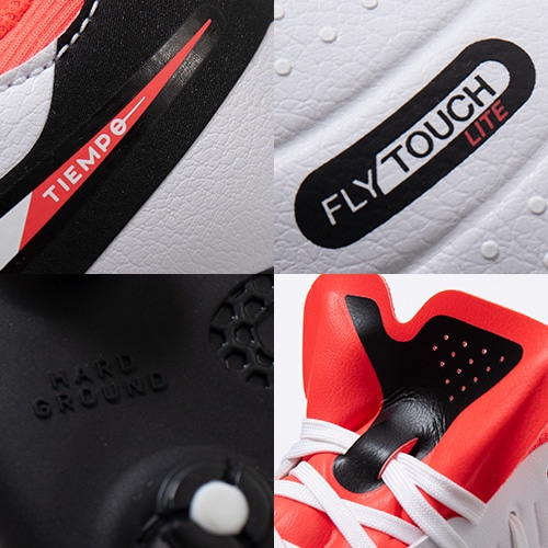 ●驚くほど柔らかい「FlyTouch Lite(フライタッチライト)」エンジニアードレザー。 スパイクが足にぴったりフィットし、素材が突っ張ることなく快適にサポート。 パッドを追加したシュータン構造で、主要なキックゾーンにしっかりとしたフィット感と快適さを提供。 マイクロファイバーの裏地でワンランク上のフィット感を実現。