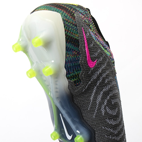 ●かかとのデザインを左右非対称の構造にすることで足とスパイクの擦れを抑え、かかとの継ぎ目がアキレス腱に触ることがなく、履き口のFlyknitが足首周りに快適にぴったりフィット。初めて採用されたアスリート向けのヒールカウンターには窪みが付いており、足の安定感やブーツの構造に妥協することなく、足とブーツの一体感と快適さを高めている。