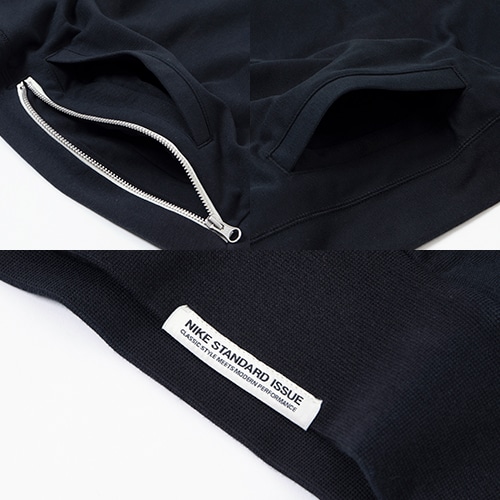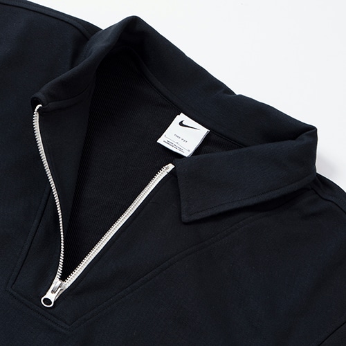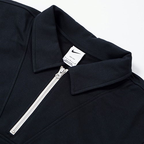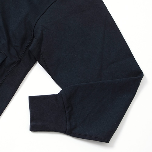 外側は滑らかで、内側は起毛加工のされていないループ状の、適度なボリュームのフレンチテリー素材を使用。通気性に優れ、どんな気温でも一年中着用したくなるほど快適です。ヒップ右側のジッパー付きポケットに、ほとんどのサイズのスマートフォンを収納可能。折り返し付きの襟、1/4ジップデザイン、ステッチ入りのプラケットは、サッカーの懐かしいドリルトップスをイメージ。