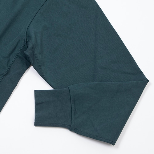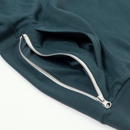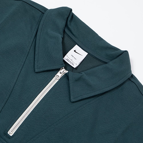 外側は滑らかで、内側は起毛加工のされていないループ状の、適度なボリュームのフレンチテリー素材を使用。通気性に優れ、どんな気温でも一年中着用したくなるほど快適です。ヒップ右側のジッパー付きポケットに、ほとんどのサイズのスマートフォンを収納可能。折り返し付きの襟、1/4ジップデザイン、ステッチ入りのプラケットは、サッカーの懐かしいドリルトップスをイメージ。