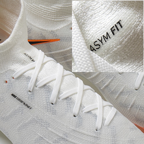 ●左右非対称の編み構造「Asym Fit」で、ドリブル、パス、シュート時のタッチゾーンを拡大。 編み構造の位置を変えることで足中央部のフィット感が増し、土踏まずの平らな人や甲高の人でも足に沿うデザインを実現。 履き口の非対称Flyknit素材が足首に心地良くフィット。 履き口に配したさりげないリブ素材で、トラップやパス時の足首より高い位置でのボールタッチをサポート。