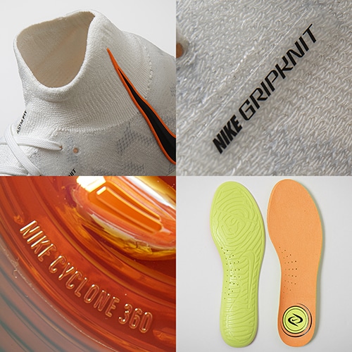 ●「Nike Cyclone 360」トラクションパターンにより、切れ込むときの俊敏さを向上させ、回転トラクションを軽減することで、素早く自信あふれる動きを実現。試合の激しさが増してもしっかりと安定感をキープし、スピードとパワーのあるカットインを可能にします。