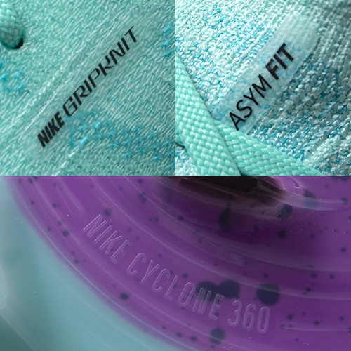 ●「Nike Cyclone 360」トラクションパターンにより、切れ込むときの俊敏さを向上させ、回転トラクションを軽減することで、素早く自信あふれる動きを実現。試合の激しさが増してもしっかりと安定感をキープし、スピードとパワーのあるカットインを可能にします。