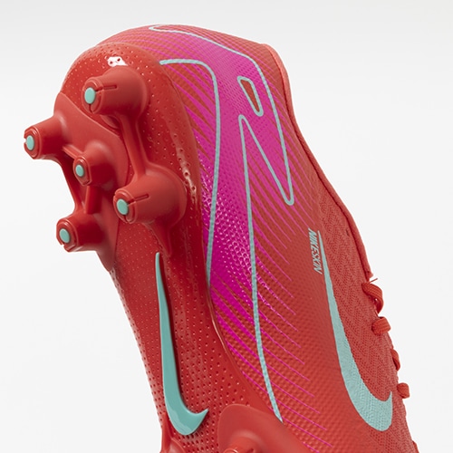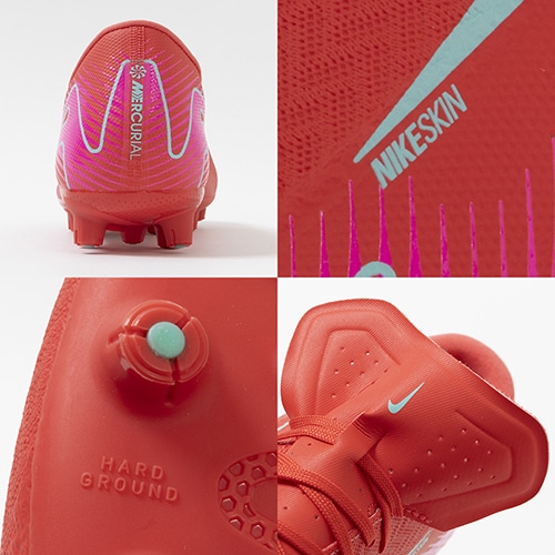 ●アッパーには、柔らかく柔軟性に優れたメッシュ素材に薄いコーティングを施したNikeSkinを使用。 素足でサッカーをしているような感覚で、ボールをコントロールできます。