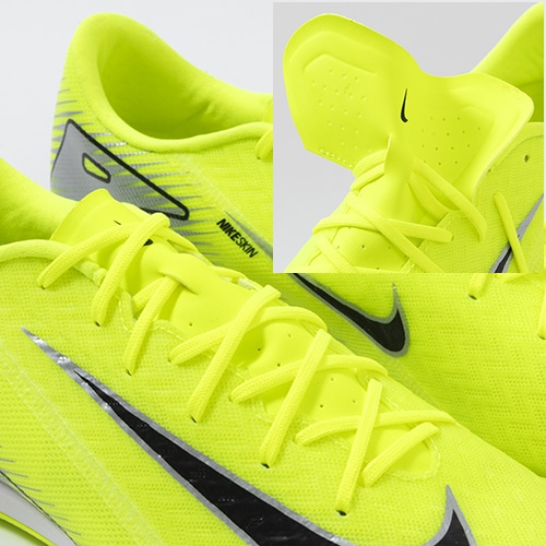 ●アッパーには、柔らかく柔軟性に優れたメッシュ素材に薄いコーティングを施したNikeSkinを使用。 素足でサッカーをしているような感覚で、ボールをコントロールできます。